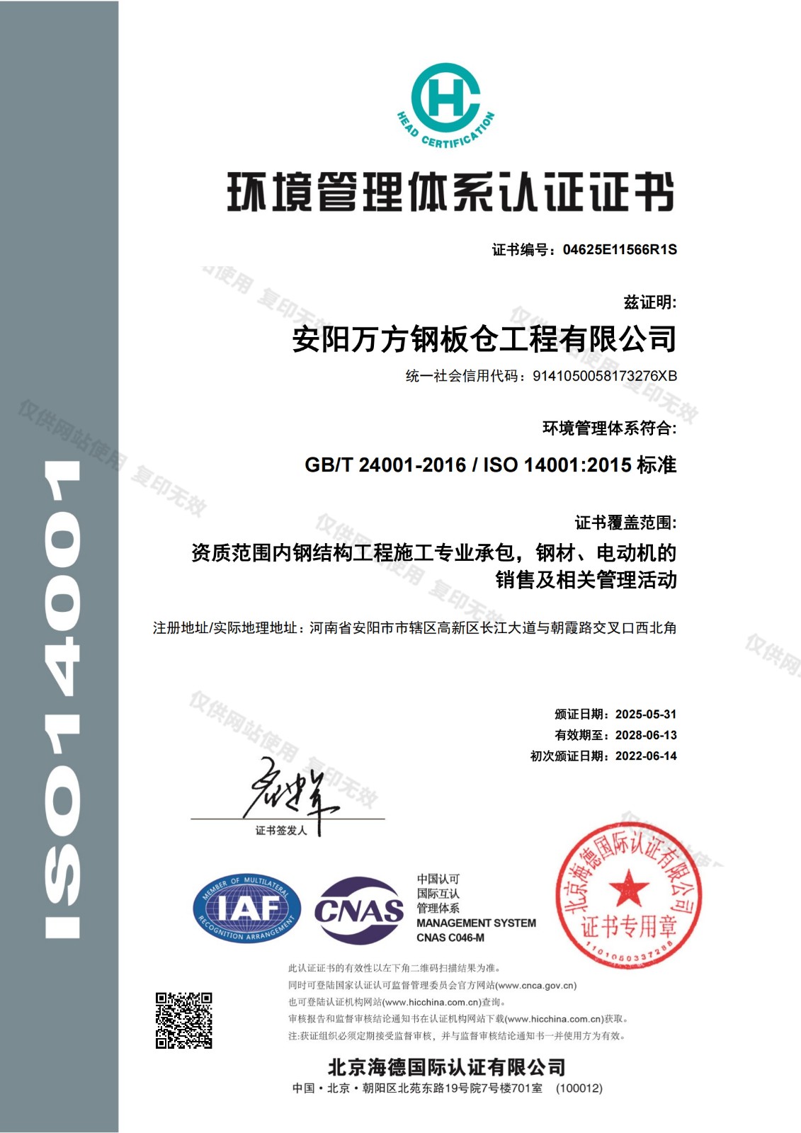 環境管理體系認證證書